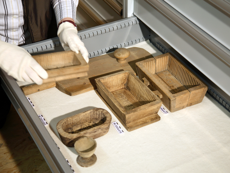 Wenn Dinge „aus dem Feld“ ins Museum kommen, sind sie staubig, oft richtig schmutzig. Staub und Flusen vorsichtig abzusaugen ist die erste Arbeit. Porzellan, Emailleware und dergleichen wird richtig gewaschen. Dafür ist im Depot die Schmutzschleuse eingerichtet. Wovor aber muss eine Reinigung Halt machen? Was ist aussagekräftige Spur von Zeit und Nutzung? Und was ist einfach Dreck? Erfahrene MuseumsarbeiterInnen holen im Einzelfall Fachrat ein.