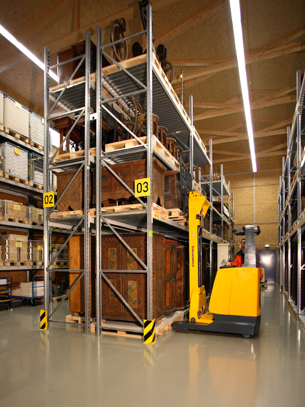 Es geht auch anders. Das Depot des Freilichtmuseums Massing ist mit Industrie-Hochregalen ausgestattet, welche Paletten der EUR-Norm 80x120cm aufnehmen. Für Kleinobjekte stehen Schränke und Schubladenkommoden bereit. Säurefreies Textilseidenpapier und säurefreier Museumskarton, unbehandelter Molton- und Nesselstoff, Aufsteller für Inventarnummern und viele andere Hilfsmittel haben sich für eine dauerhafte und alltagstaugliche Einlagerung bewährt.